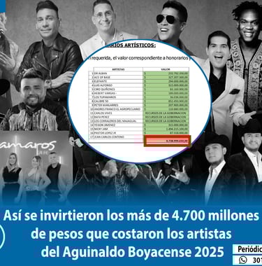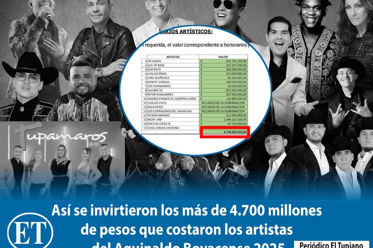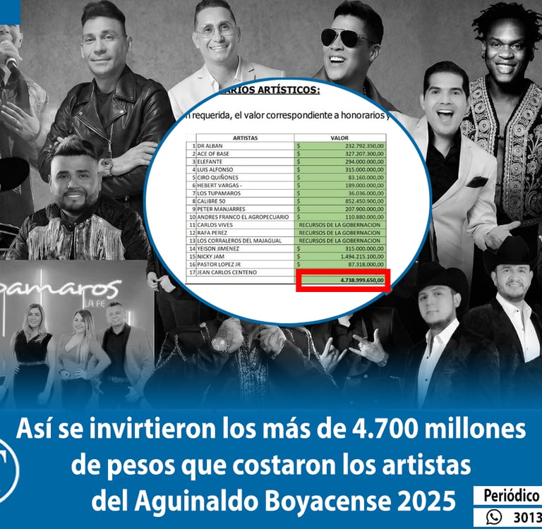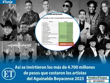 Tras la respuesta a un derecho de petición y ante la opacidad en el reporte detallado de los gastos en el Sistema Electrónico para la Contratación Pública (secop), se conocieron los costos individuales de la nómina artística del Aguinaldo Boyacense 2025. Los documentos oficiales confirman que la administración municipal de Tunja destinó un total de 4.738.999.650 pesos para el pago de honorarios y producción de artistas, una información que no fue desglosada públicamente durante la ejecución del evento.