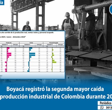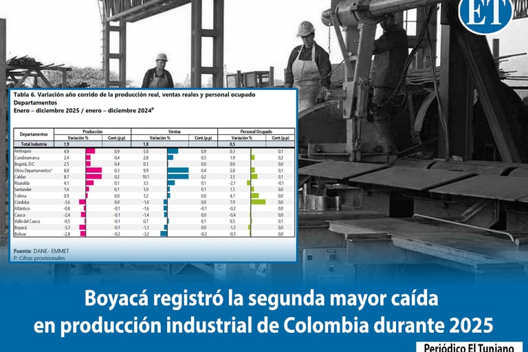 La industria manufacturera del departamento de Boyacá cerró el año 2025 con un balance negativo, posicionándose como la segunda región con el peor desempeño productivo en el territorio nacional. Según las cifras de la Encuesta Mensual Manufacturera con Enfoque Territorial (EMMET) presentadas por el DANE, la producción real en el departamento se contrajo un 3,3%, cifra solo superada por el descenso del 3,6% registrado en Córdoba.