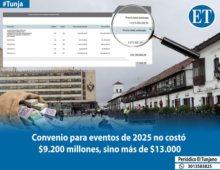 Lo que el municipio de Tunja proyectó originalmente en mayo de 2025 como una inversión de $9.273.826.189 para su agenda cultural e institucional, terminó cerrando la vigencia con un costo total de $13.125.045.335. El análisis de la ejecución presupuestal del Convenio 972 de 2025 revela que, mediante cinco modificaciones consecutivas, el valor se incrementó en más de $3.850 millones. Según los registros públicos de la administración, se retiraron recursos de programas de formación y eventos gremiales para trasladar ese capital a la logística operativa del Aguinaldo Boyacense y otros rubros de fin de año.