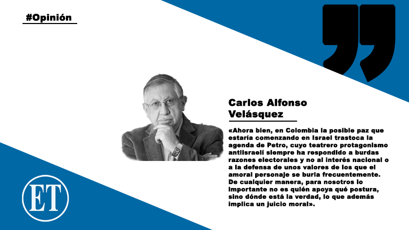 Ahora bien, en Colombia la posible paz que estaría comenzando en Israel trastoca la agenda de Petro, cuyo teatrero protagonismo antiisraelí siempre ha respondido a burdas razones electorales y no al interés nacional o a la defensa de unos valores de los que el amoral personaje se burla frecuentemente. De cualquier manera, para nosotros lo importante no es quién apoya qué postura, sino dónde está la verdad, lo que además implica un juicio moral.