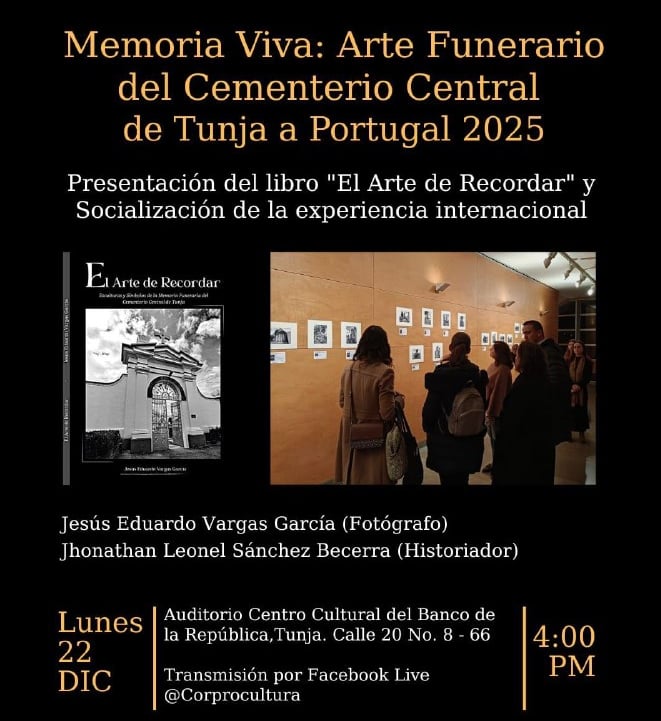 La Corporación Promotores del Patrimonio Cultural de Colombia (Corprocultura) presentará el próximo lunes 22 de diciembre en Tunja los resultados del proyecto "Memoria Viva", el cual vinculó la riqueza histórica del Cementerio Central de la ciudad con escenarios culturales en Viseu, Portugal. Durante la jornada se realizará el lanzamiento oficial del libro titulado "El Arte de Recordar", obra que documenta la simbología y las esculturas del campo santo local.