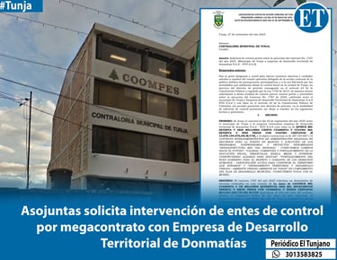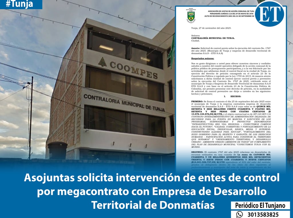 El contrato firmado entre la Administración Municipal de Tunja y la Empresa de Desarrollo Territorial Donmatías S.A.S. sigue generando inquietudes debido al alto valor del mismo (más de $15.070 millones), la modalidad de contratación y selección del contratista, y el anticipo del 95%.