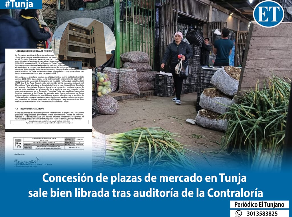 La Contraloría Municipal de Tunja determinó que el Consorcio Tunja Productiva ha venido cumpliendo con las obligaciones contractuales de pagos y mantenimiento de las plazas de mercado. Tras una Actuación Especial de Fiscalización motivada por denuncias ciudadanas, el organismo de control no constituyó hallazgos de irregularidades en la gestión del concesionario.