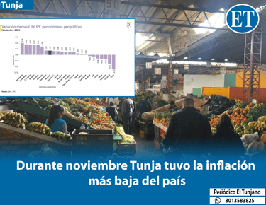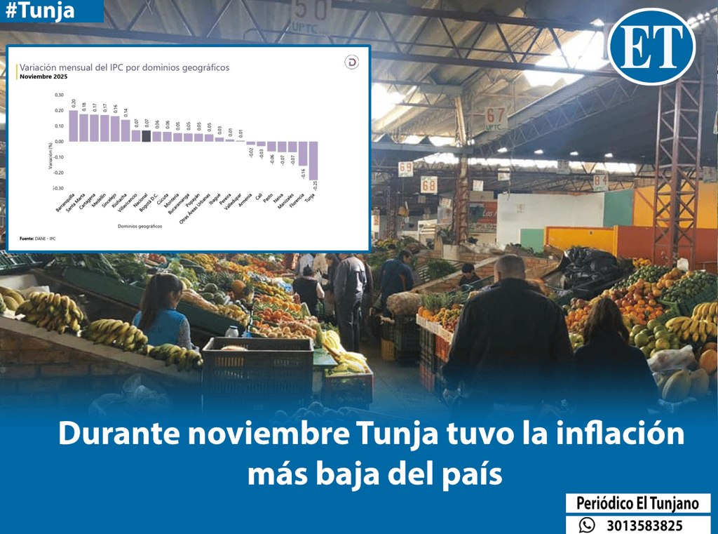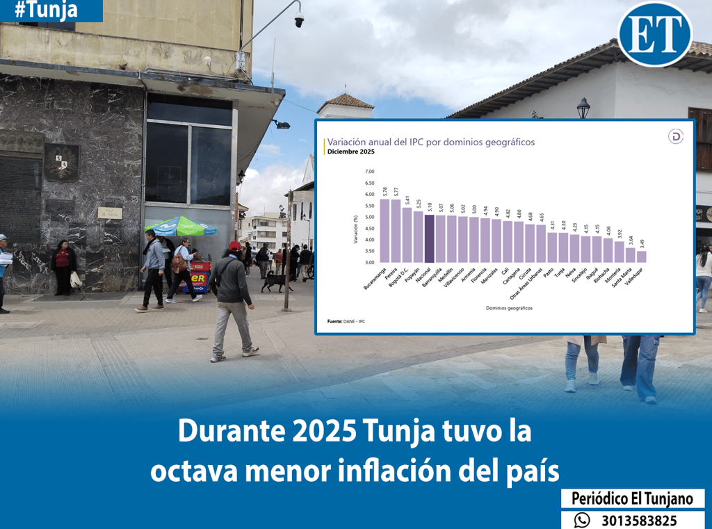 En lo que refiere a la variación anual, es decir, a lo largo de 2025, Tunja fue la octava ciudad con menor variación del IPC, registrando un dato de 4,30%, mientras que el promedio nacional fue de 5,10%. La ciudad con menor inflación a lo largo de 2025 fue Valledupar (3,49%), mientras que la que tuvo la mayor variación fue Bucaramanga (5,78%).