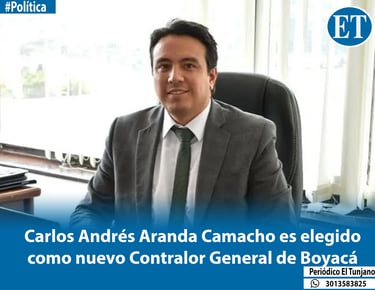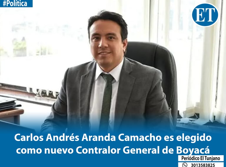 La Asamblea Departamental de Boyacá eligió a Carlos Andrés Aranda Camacho como Contralor General del Departamento para el periodo 2025-2029, en la sesión llevada a cabo el pasado 30 de noviembre. La designación se concretó con nueve votos a favor por parte de la mayoría de la corporación.