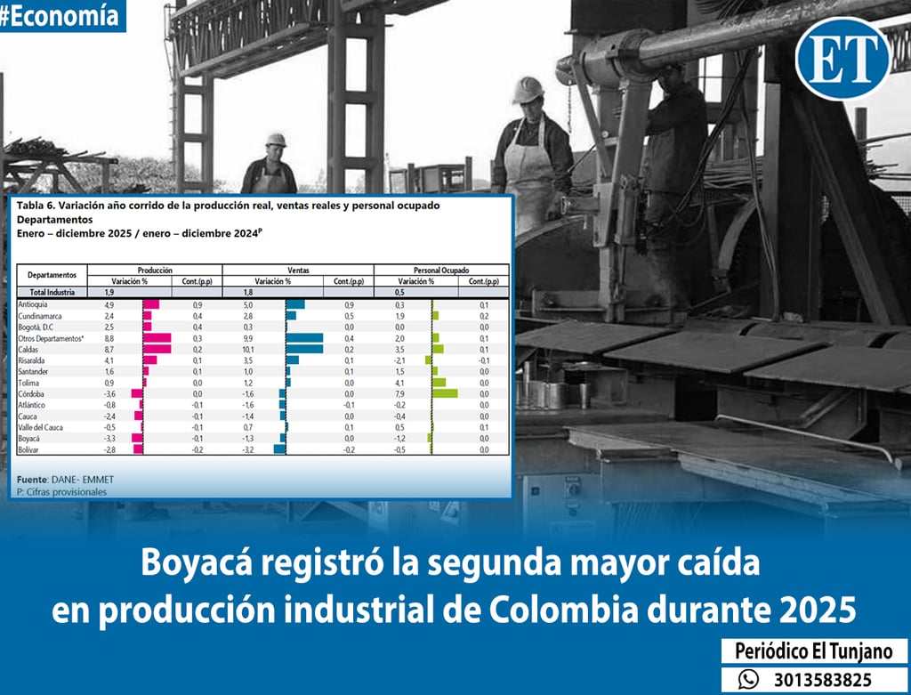 La industria manufacturera del departamento de Boyacá cerró el año 2025 con un balance negativo, posicionándose como la segunda región con el peor desempeño productivo en el territorio nacional. Según las cifras de la Encuesta Mensual Manufacturera con Enfoque Territorial (EMMET) presentadas por el DANE, la producción real en el departamento se contrajo un 3,3%, cifra solo superada por el descenso del 3,6% registrado en Córdoba.