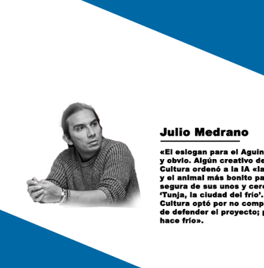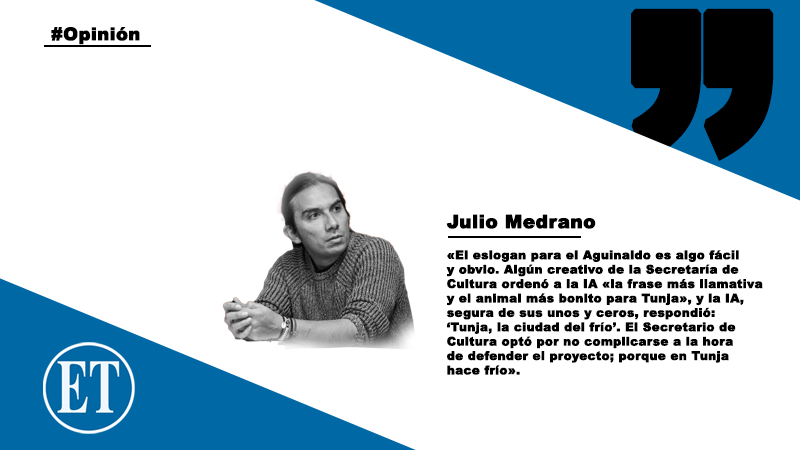 El eslogan para el Aguinaldo es algo fácil y obvio. Algún creativo de la Secretaría de Cultura ordenó a la IA «la frase más llamativa y el animal más bonito para Tunja», y la IA, segura de sus unos y ceros, respondió: ‘Tunja, la ciudad del frío’. El Secretario de Cultura optó por no complicarse a la hora de defender el proyecto; porque en Tunja hace frío.