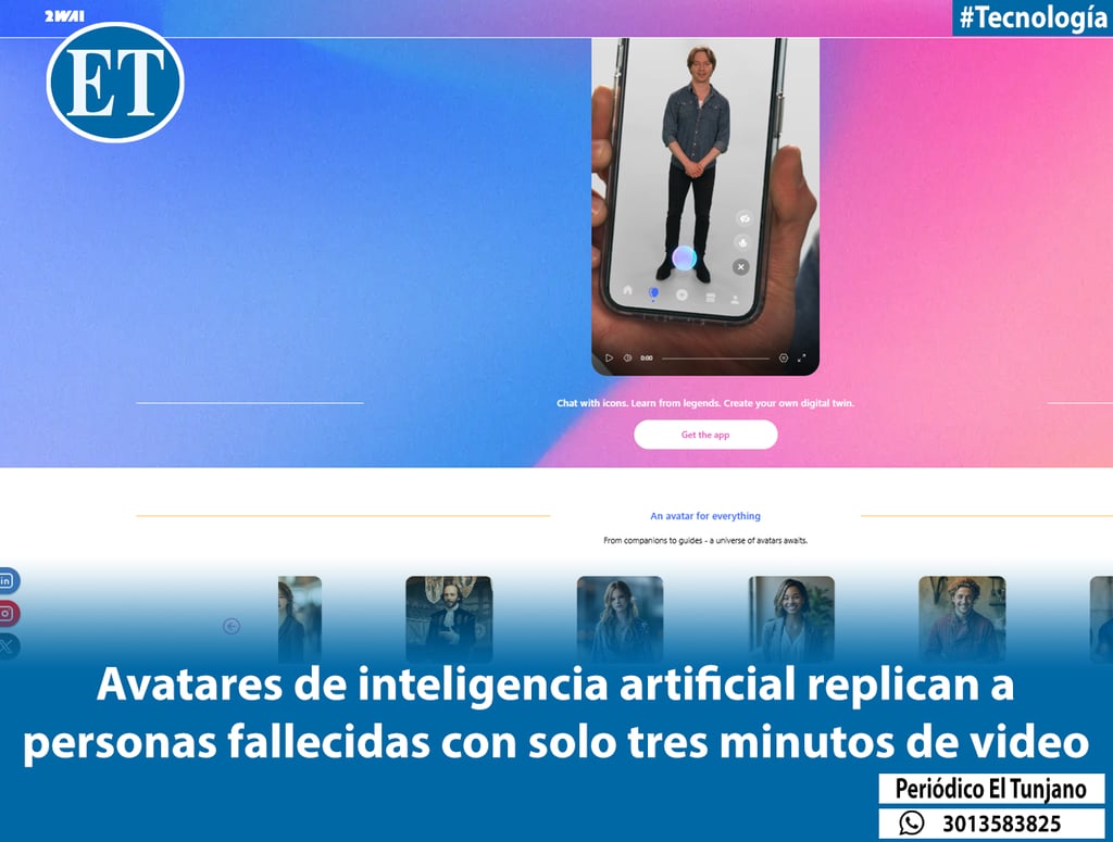 La compañía tecnológica 2wai, con sede en Los Ángeles, ha lanzado una aplicación móvil que permite a los usuarios crear versiones digitales interactivas de seres queridos que han fallecido utilizando un mínimo de material de archivo. La tecnología se basa en la inteligencia artificial para generar un "HoloAvatar" capaz de simular la apariencia, voz y conversación de la persona, requiriendo apenas tres minutos de video para su configuración inicial.
